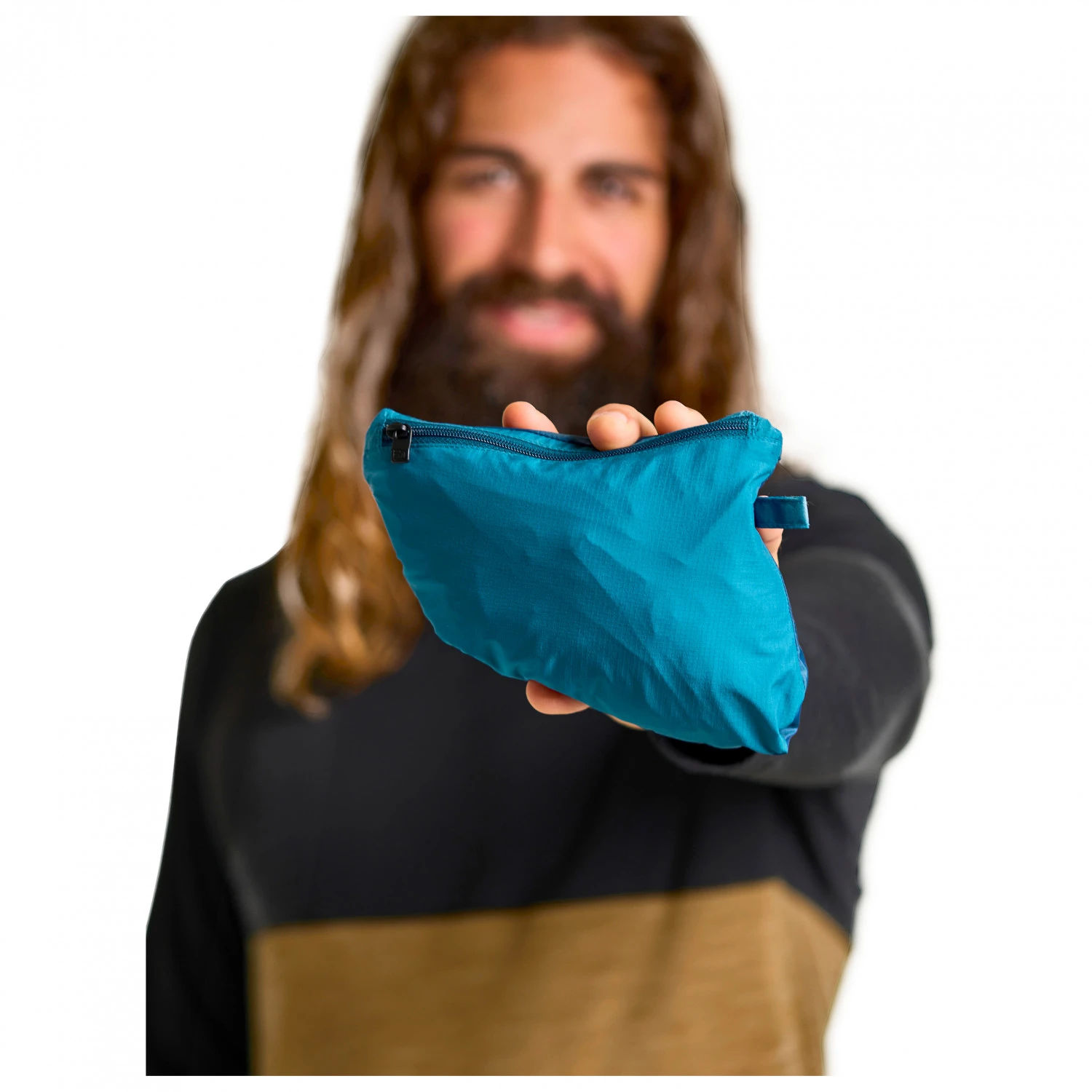 - opstaande kraag, opbergbaar in eigen zak, elastische zoom